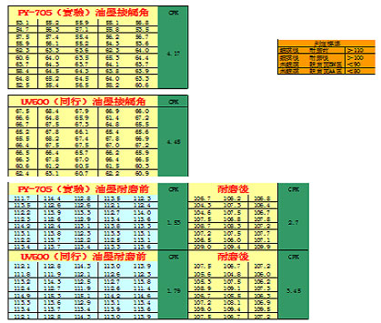 使用PY-705印刷後產(chǎn)品水滴角均在標(biāo)準(zhǔn)範(fàn)圍內(nèi),CPK>1.33,表現(xiàn)較穩(wěn)定